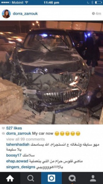 وفور خروجها بسلامة من الحادث، نشرت "درّة" صوراً لسيارتها المهشمة عبر صفحتها الخاصة على موقع "إنستغرام"، قبل أن تقوم بحذفها بعد وقتٍ قصير بسبب الانتقادات والتعليقات غير اللائقة التي كتبها متابعوها تعليقاً على الصورة.